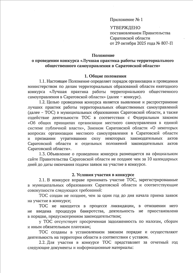Постановление Правительства Саратовской области от 29.10.2025 N 807-П "О конкурсе "Лучшая практика работы территориального общественного самоуправления в Саратовской области" (вместе с "Положением о проведении конкурса "Лучшая практика работы территориального общественного самоуправления в Саратовской области", "Положением о порядке предоставления из областного бюджета иных межбюджетных трансфертов бюджетам муниципальных округов, городских округов и поселений области на поощрение муниципальных округов, городских округов и поселений области по результатам проведения конкурса "Лучшая практика работы территориального общественного самоуправления в Саратовской области")