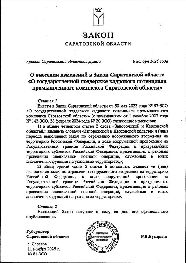 Закон Саратовской области от 11.11.2025 N 81-ЗСО "О внесении изменений в Закон Саратовской области "О государственной поддержке кадрового потенциала промышленного комплекса Саратовской области" (принят Саратовской областной Думой 06.11.2025)