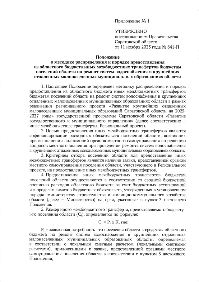 Постановление Правительства Саратовской области от 11.11.2025 N 841-П "О методике распределения и порядке предоставления из областного бюджета иных межбюджетных трансфертов бюджетам поселений области на ремонт систем водоснабжения в крупнейших отдаленных малонаселенных муниципальных образованиях области" (вместе с "Положением о методике распределения и порядке предоставления из областного бюджета иных межбюджетных трансфертов бюджетам поселений области на ремонт систем водоснабжения в крупнейших отдаленных малонаселенных муниципальных образованиях области")
