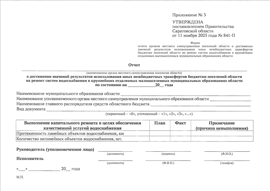 Постановление Правительства Саратовской области от 11.11.2025 N 841-П "О методике распределения и порядке предоставления из областного бюджета иных межбюджетных трансфертов бюджетам поселений области на ремонт систем водоснабжения в крупнейших отдаленных малонаселенных муниципальных образованиях области" (вместе с "Положением о методике распределения и порядке предоставления из областного бюджета иных межбюджетных трансфертов бюджетам поселений области на ремонт систем водоснабжения в крупнейших отдаленных малонаселенных муниципальных образованиях области")