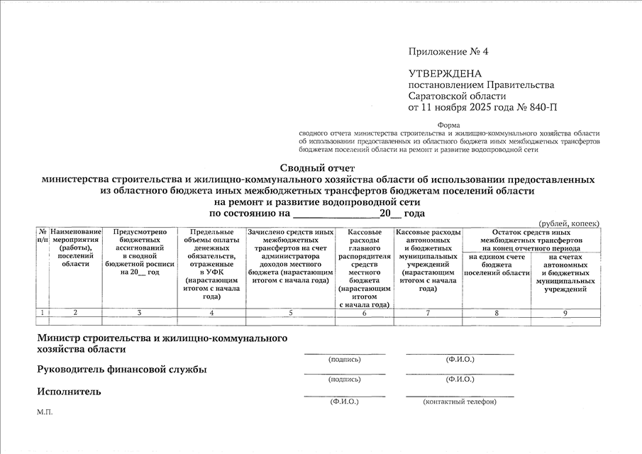 Постановление Правительства Саратовской области от 11.11.2025 N 840-П "О методике распределения и порядке предоставления из областного бюджета иных межбюджетных трансфертов бюджетам поселений области на ремонт и развитие водопроводной сети" (вместе с "Положением о методике распределения и порядке предоставления из областного бюджета иных межбюджетных трансфертов бюджетам поселений области на ремонт и развитие водопроводной сети")