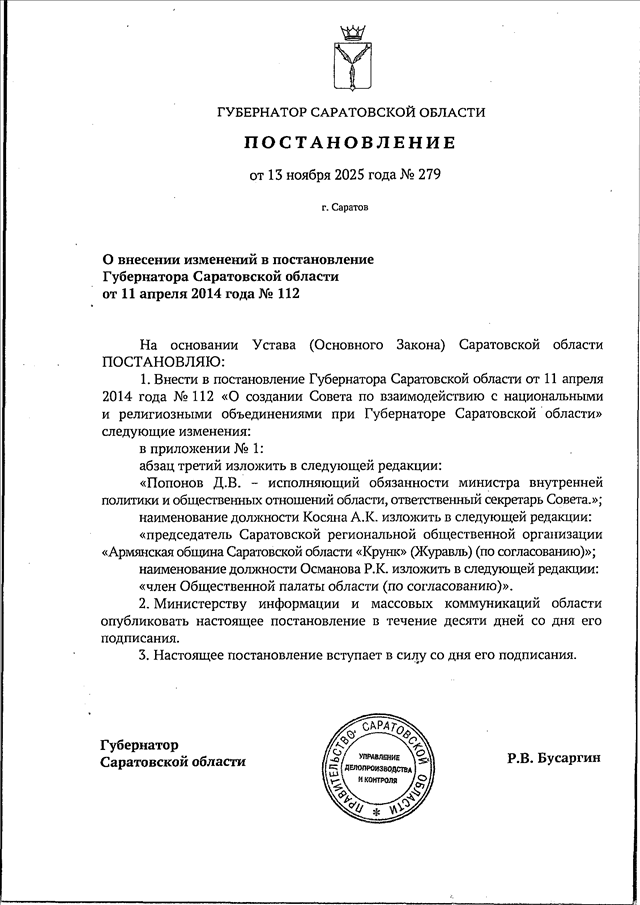 Постановление Губернатора Саратовской области от 13.11.2025 N 279 "О внесении изменений в постановление Губернатора Саратовской области от 11 апреля 2014 года N 112"