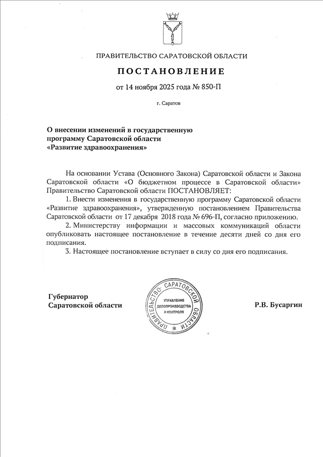 Постановление Правительства Саратовской области от 14.11.2025 N 850-П "О внесении изменений в государственную программу Саратовской области "Развитие здравоохранения"