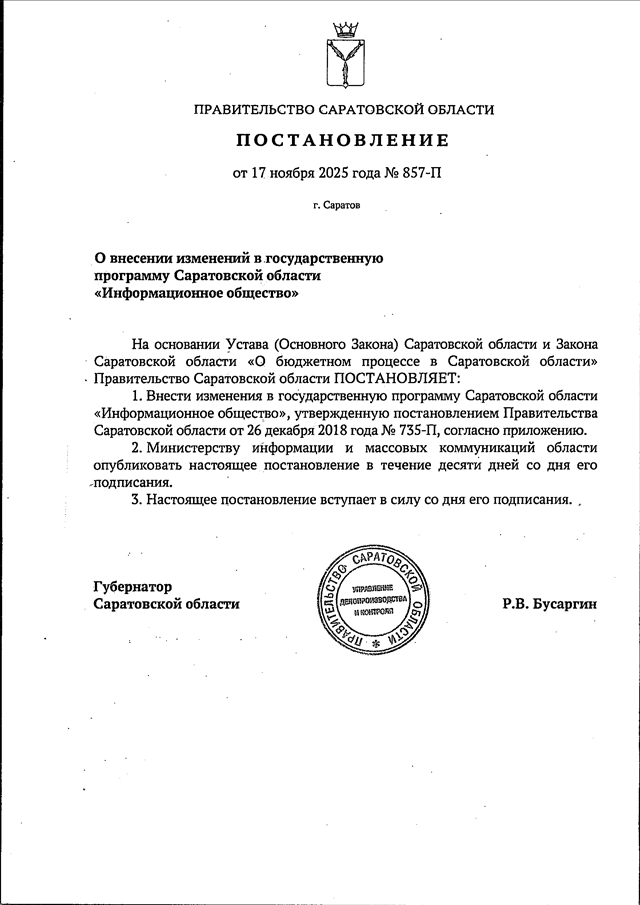 Постановление Правительства Саратовской области от 17.11.2025 N 857-П "О внесении изменений в государственную программу Саратовской области "Информационное общество"