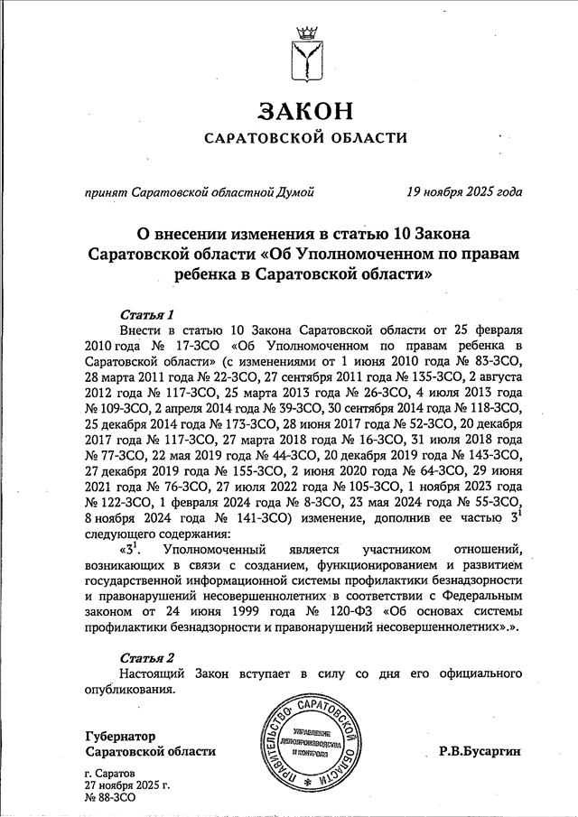 Закон Саратовской области от 27.11.2025 N 88-ЗСО "О внесении изменения в статью 10 Закона Саратовской области "Об Уполномоченном по правам ребенка в Саратовской области" (принят Саратовской областной Думой 19.11.2025)
