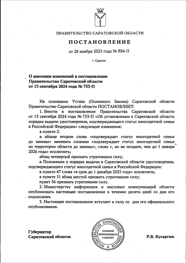 Постановление Правительства Саратовской области от 28.11.2025 N 884-П "О внесении изменений в постановление Правительства Саратовской области от 13 сентября 2024 года N 753-П"