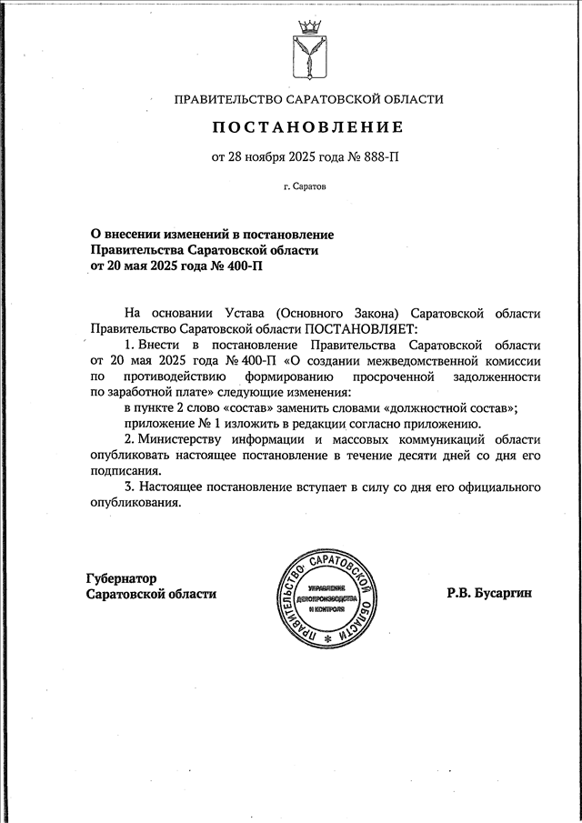 Постановление Правительства Саратовской области от 28.11.2025 N 888-П "О внесении изменений в постановление Правительства Саратовской области от 20 мая 2025 года N 400-П"