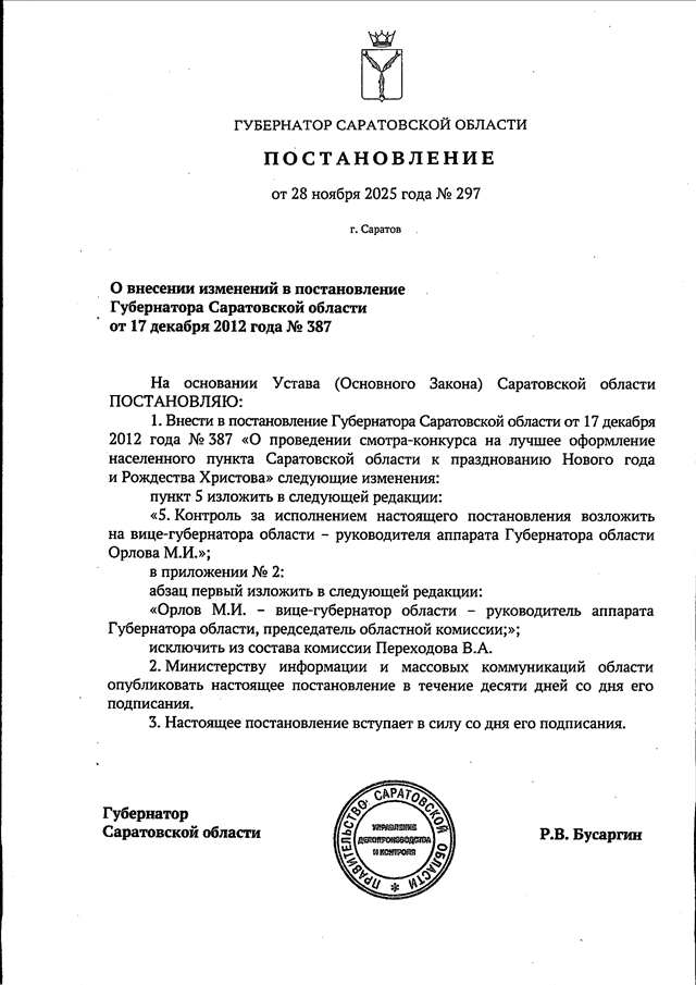 Постановление Губернатора Саратовской области от 28.11.2025 N 297 "О внесении изменений в постановление Губернатора Саратовской области от 17 декабря 2012 года N 387"