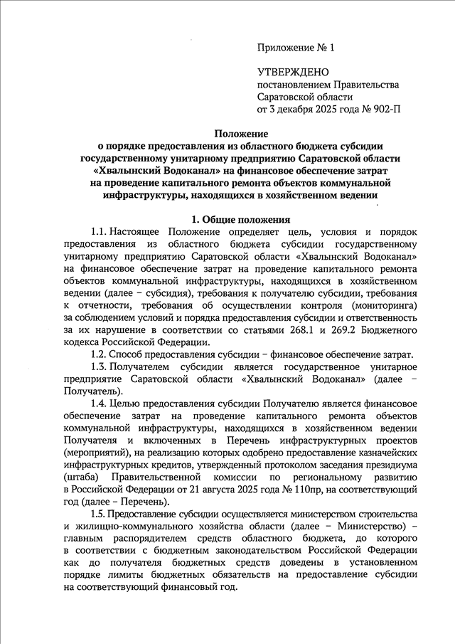 Постановление Правительства Саратовской области от 03.12.2025 N 902-П "Об утверждении Положения о порядке предоставления из областного бюджета субсидии государственному унитарному предприятию Саратовской области "Хвалынский Водоканал" на финансовое обеспечение затрат на проведение капитального ремонта объектов коммунальной инфраструктуры, находящихся в хозяйственном ведении"