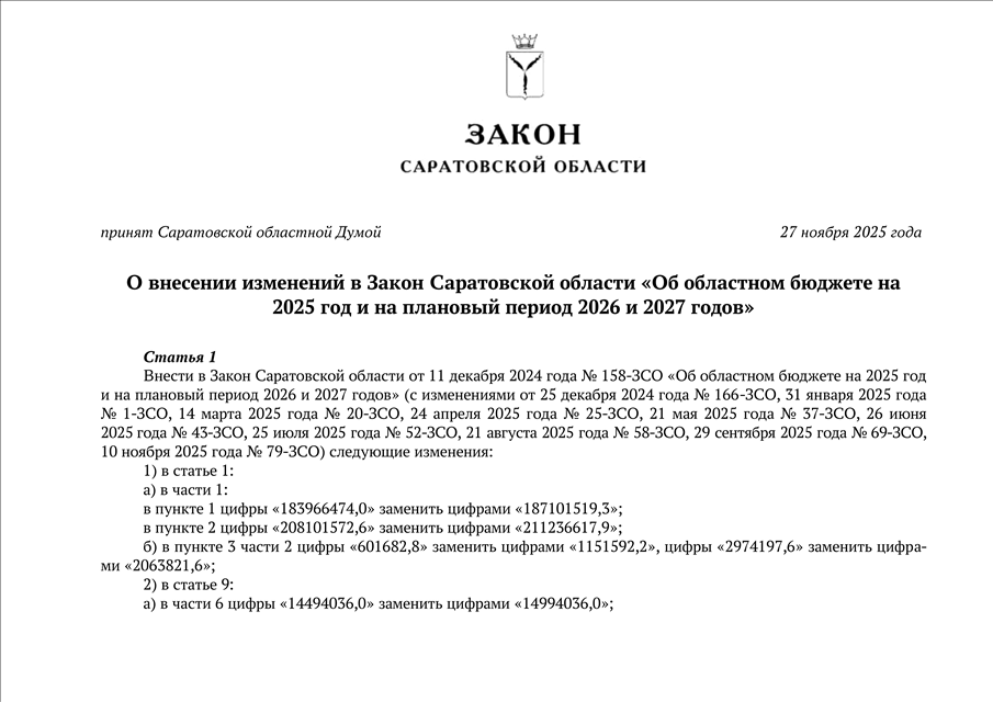 Закон Саратовской области от 01.12.2025 N 94-ЗСО "О внесении изменений в Закон Саратовской области "Об областном бюджете на 2025 год и на плановый период 2026 и 2027 годов" (принят Саратовской областной Думой 27.11.2025)