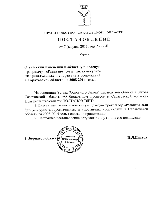Постановление Правительства Саратовской области от 07.02.2011 N 77-П "О внесении изменений в областную целевую программу "Развитие сети физкультурно-оздоровительных и спортивных сооружений в Саратовской области на 2008 - 2014 годы"