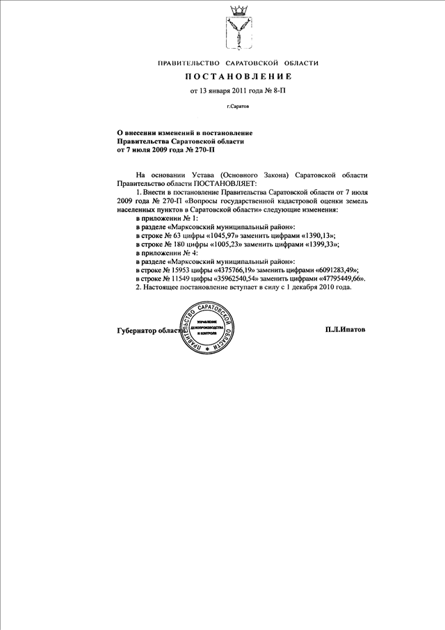 Постановление Правительства Саратовской области от 13.01.2011 N 8-П "О внесении изменений в постановление Правительства Саратовской области от 7 июля 2009 г. N 270-П"