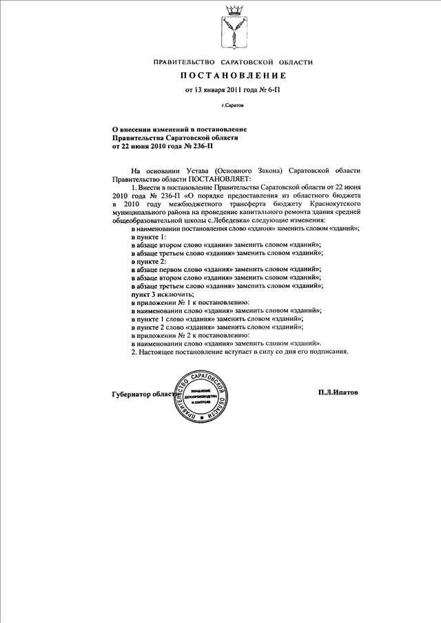 Постановление Правительства Саратовской области от 13.01.2011 N 6-П "О внесении изменений в постановление Правительства Саратовской области от 22 июня 2010 г. N 236-П"