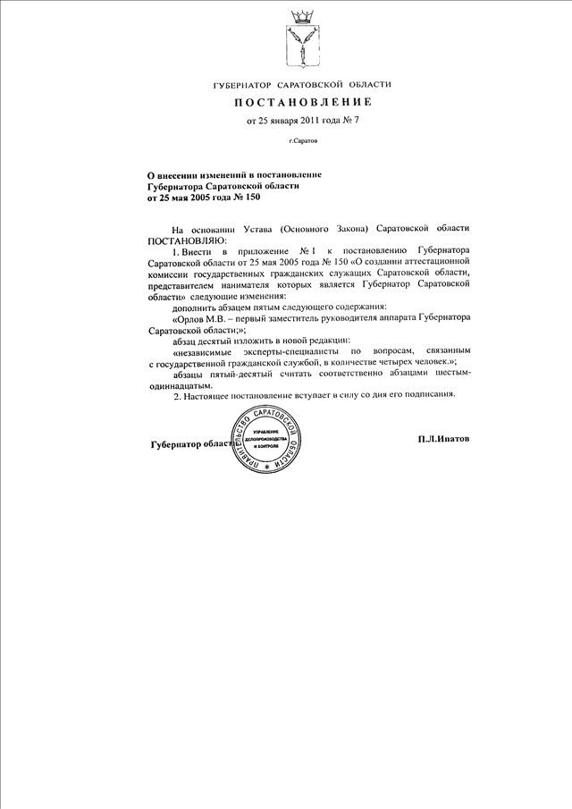 Постановление Губернатора Саратовской области от 25.01.2011 N 7 "О внесении изменений в постановление Губернатора Саратовской области от 25 мая 2005 г. N 150"