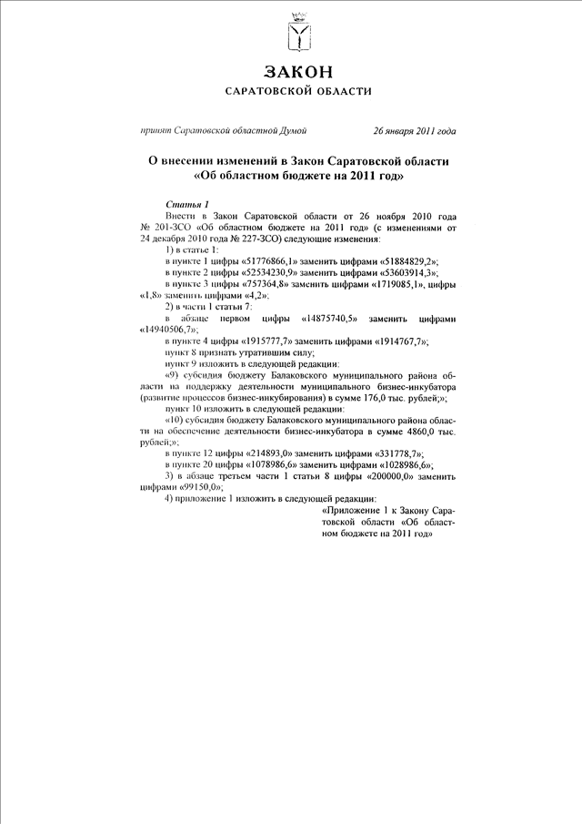 Закон Саратовской области от 27.01.2011 N 1-ЗСО "О внесении изменений в Закон Саратовской области "Об областном бюджете на 2011 год"