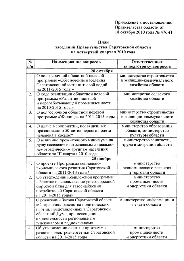 Постановление Правительства Саратовской области от 18.10.2010 N 476-П "О Плане заседаний Правительства Саратовской области на четвертый квартал 2010 года"