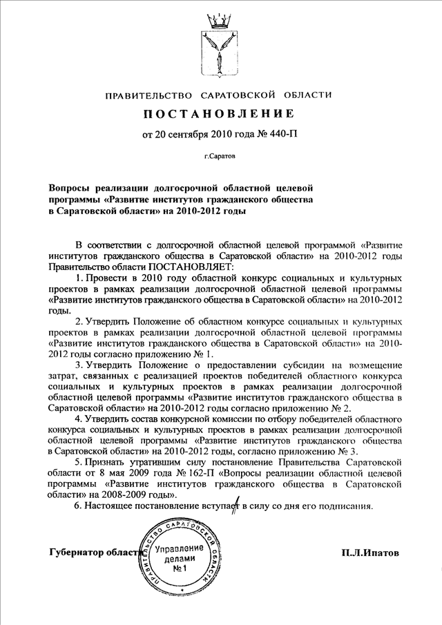 Постановление Правительства Саратовской области от 20.09.2010 N 440-П "Вопросы реализации долгосрочной областной целевой программы "Развитие институтов гражданского общества в Саратовской области" на 2010 - 2012 годы"