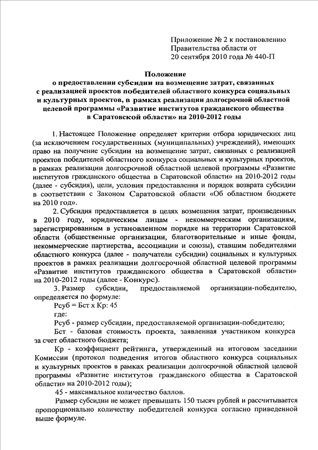 Постановление Правительства Саратовской области от 20.09.2010 N 440-П "Вопросы реализации долгосрочной областной целевой программы "Развитие институтов гражданского общества в Саратовской области" на 2010 - 2012 годы"