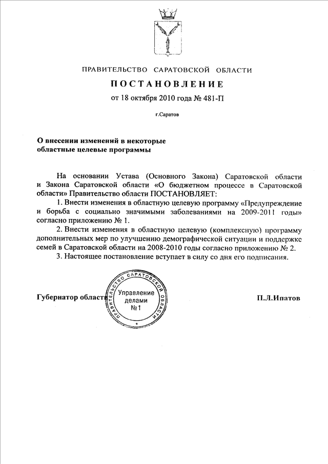 Постановление Правительства Саратовской области от 18.10.2010 N 481-П "О внесении изменений в некоторые областные целевые программы"