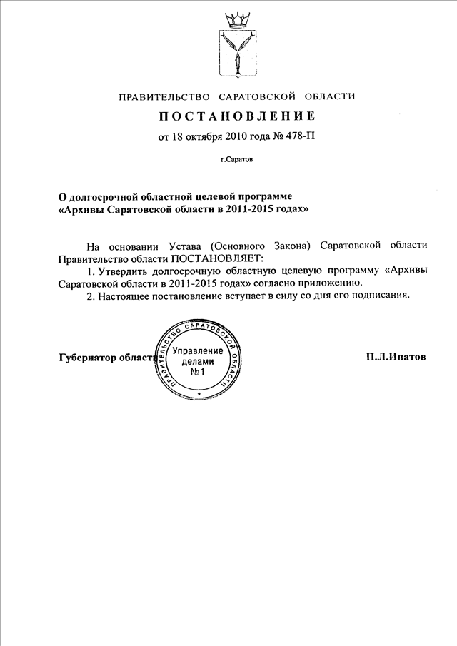 Постановление Правительства Саратовской области от 18.10.2010 N 478-П "О долгосрочной областной программе "Архивы Саратовской области в 2011-2015 годах"