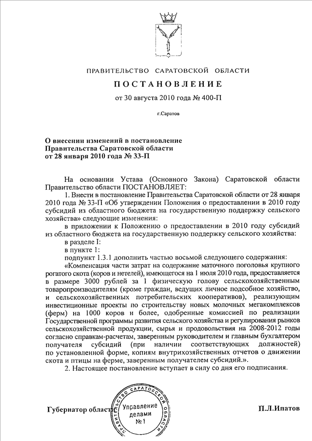 Постановление Правительства Саратовской области от 30.08.2010 N 400-П "О внесении изменений в постановление Правительства Саратовской области от 28 января 2010 г. N 33-П"