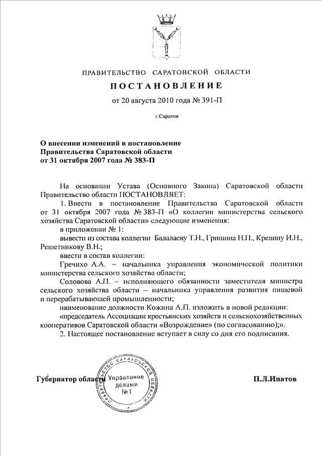 Постановление Правительства Саратовской области от 20.08.2010 N 391-П "О внесении изменений в постановление Правительства Саратовской области от 31 октября 2007 г. N 383-П"