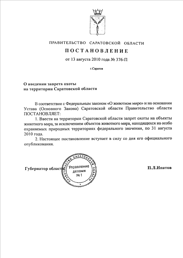 Постановление Правительства Саратовской области от 13.08.2010 N 376-П "О введении запрета охоты на территории Саратовской области"