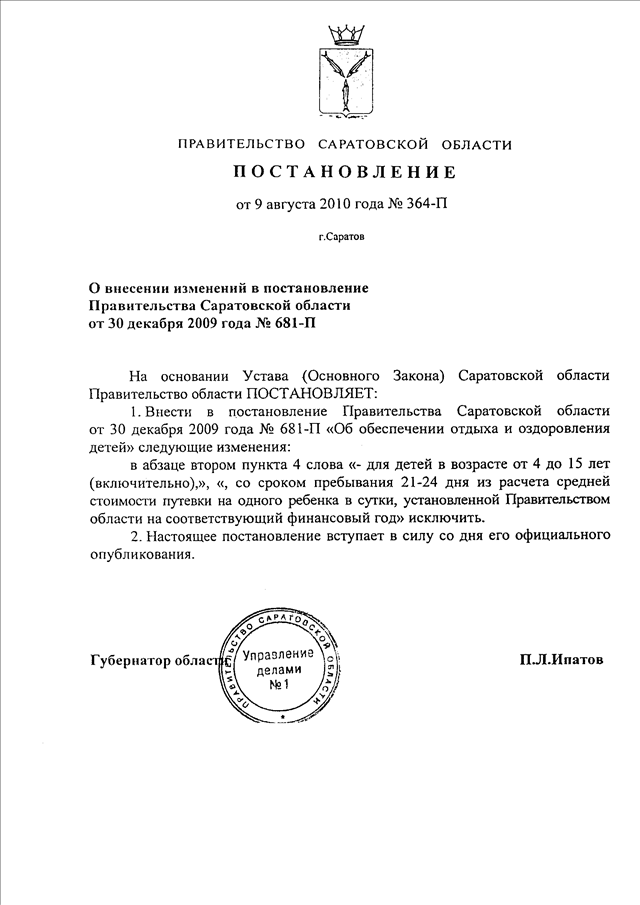 Постановление Правительства Саратовской области от 09.08.2010 N 364-П "О внесении изменений в постановление Правительства Саратовской области от 30 декабря 2009 г. N 681-П"