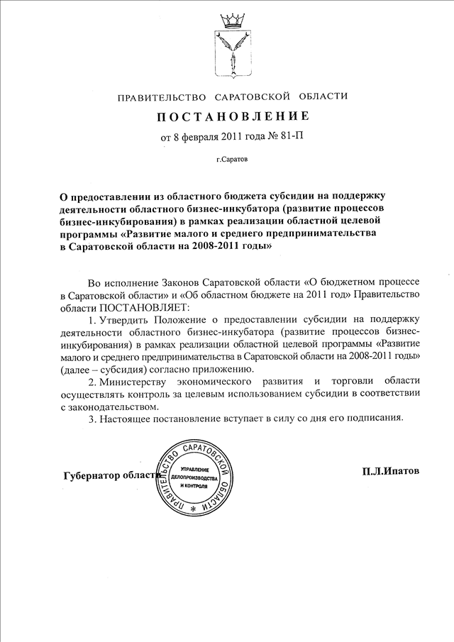 Постановление Правительства Саратовской области от 08.02.2011 N 81-П "О предоставлении из областного бюджета субсидии на поддержку деятельности областного бизнес-инкубатора (развитие процессов бизнес-инкубирования) в рамках реализации областной целевой программы "Развитие малого и среднего предпринимательства в Саратовской области на 2008 - 2011 годы"