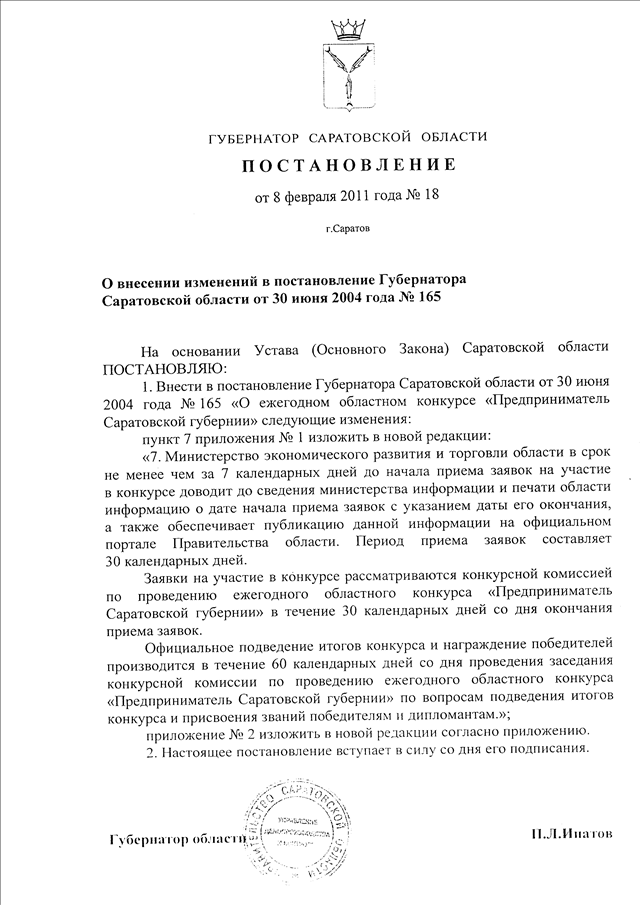 Постановление Губернатора Саратовской области от 08.02.2011 N 18 "О внесении изменений в постановление Губернатора Саратовской области от 30 июня 2004 N 165"