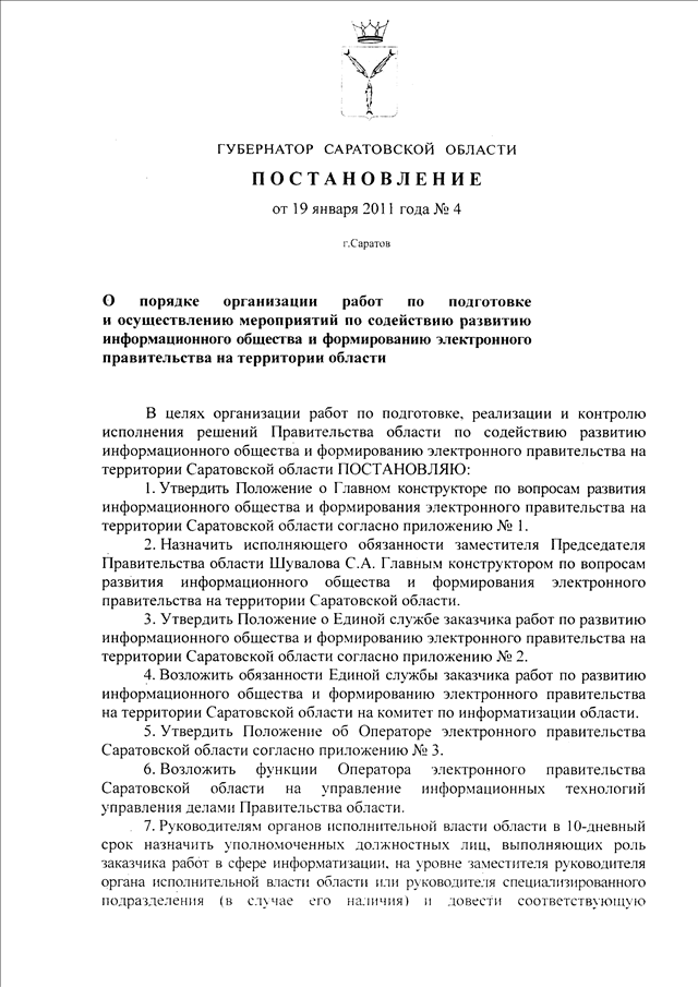 Постановление Губернатора Саратовской области от 19.01.2011 N 4 "О порядке организации работ по подготовке и осуществлению мероприятий по содействию развитию информационного общества и формированию электронного правительства на территории области"
