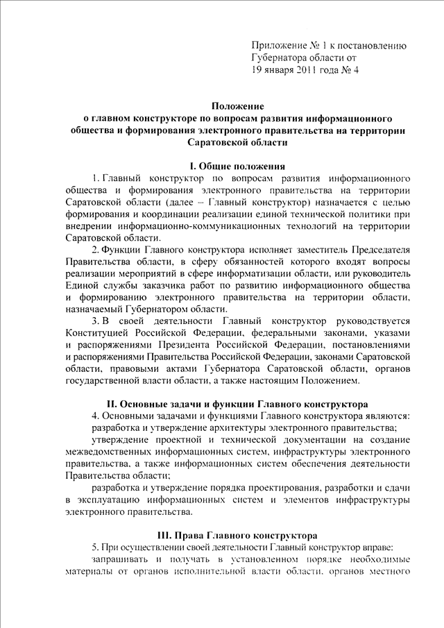 Постановление Губернатора Саратовской области от 19.01.2011 N 4 "О порядке организации работ по подготовке и осуществлению мероприятий по содействию развитию информационного общества и формированию электронного правительства на территории области"