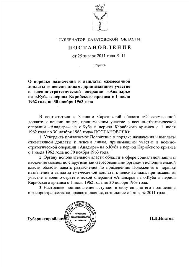 Постановление Губернатора Саратовской области от 25.01.2011 N 11 "О порядке назначения и выплаты ежемесячной доплаты к пенсии лицам, принимавшим участие в военно-стратегической операции "Анадырь" на о. Куба в период Карибского кризиса с 1 июля 1962 года по 30 ноября 1963 года"