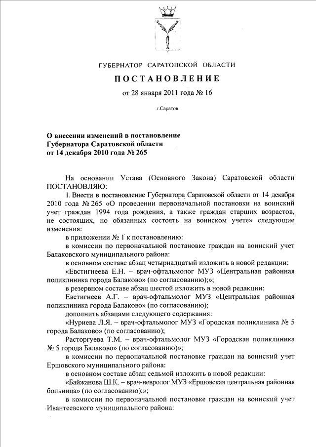 Постановление Губернатора Саратовской области от 28.01.2011 N 16 "О внесении изменений в постановление Губернатора Саратовской области от 14 декабря 2010 г. N 265"