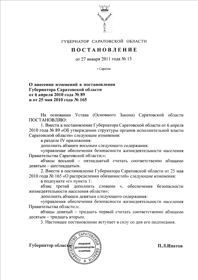 Постановление Губернатора Саратовской области от 27.01.2011 N 13 "О внесении изменений в постановления Губернатора Саратовской области от 6 апреля 2010 г. N 89 и от 25 мая 2010 г. N 165"