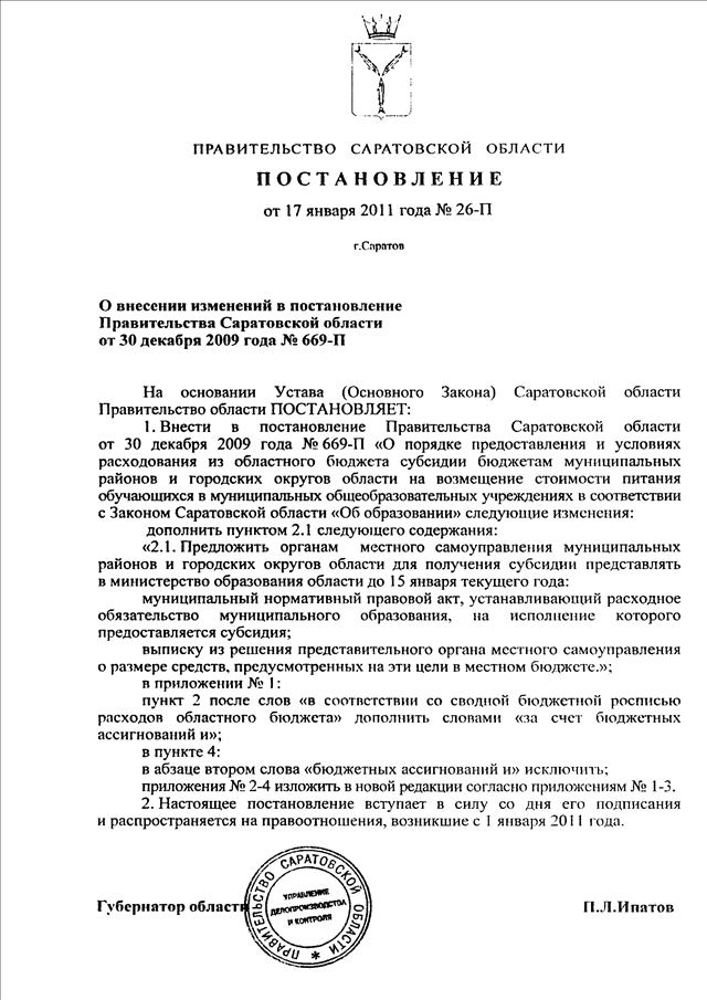 Постановление Правительства Саратовской области от 17.01.2011 N 26-П "О внесении изменений в постановление Правительства Саратовской области от 30 декабря 2009 г. N 669-П"