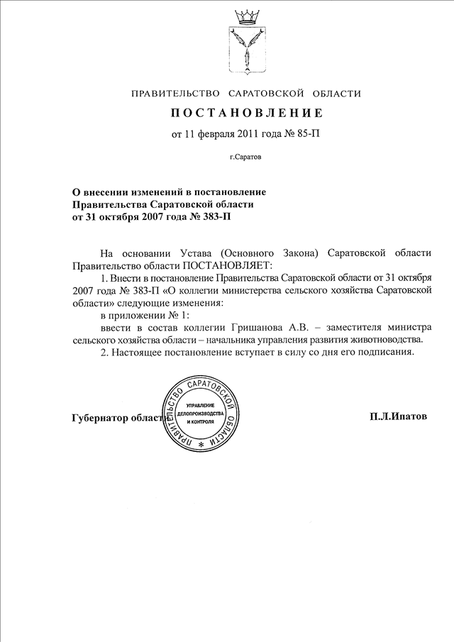 Постановление Правительства Саратовской области от 11.02.2011 N 85-П "О внесении изменений в постановление Правительства Саратовской области от 31 октября 2007 г. N 383-П"
