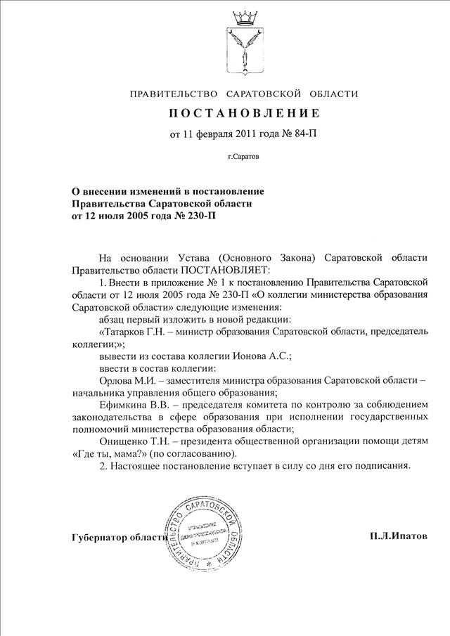 Постановление Правительства Саратовской области от 11.02.2011 N 84-П "О внесении изменений в постановление Правительства Саратовской области от 12 июля 2005 г. N 230-П"