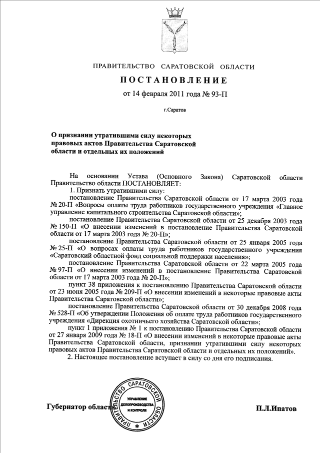 Постановление Правительства Саратовской области от 14.02.2011 N 93-П "О признании утратившими силу некоторых правовых актов Правительства Саратовской области и отдельных их положений"