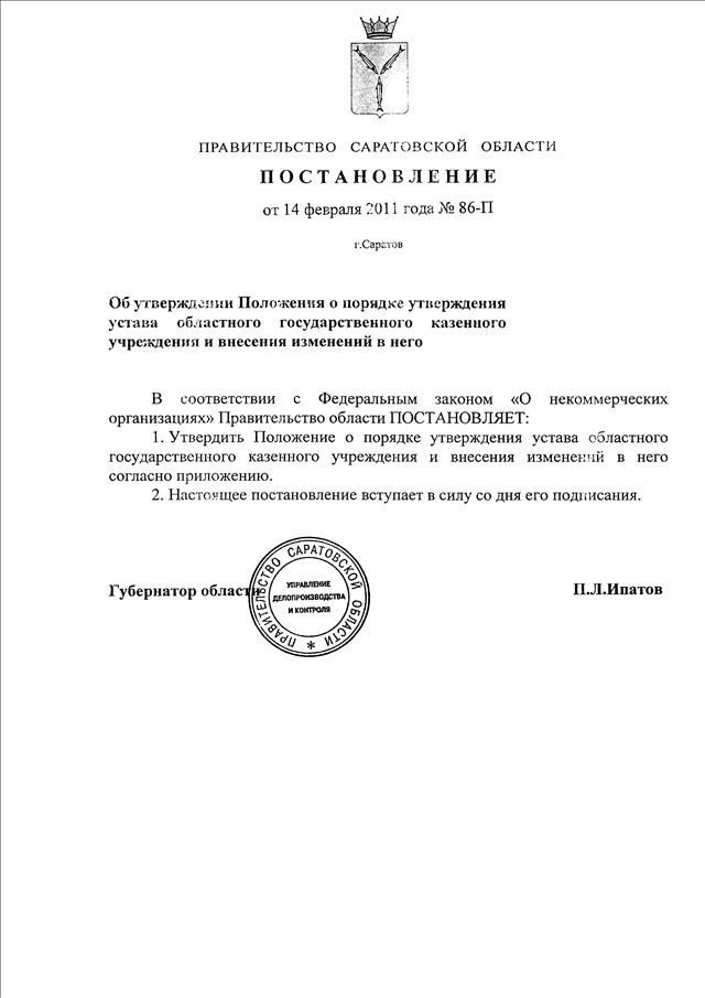Постановление Правительства Саратовской области от 14.02.2011 N 86-П "Об утверждении Положения о порядке утверждения устава областного государственного казенного учреждения и внесения изменений в него"