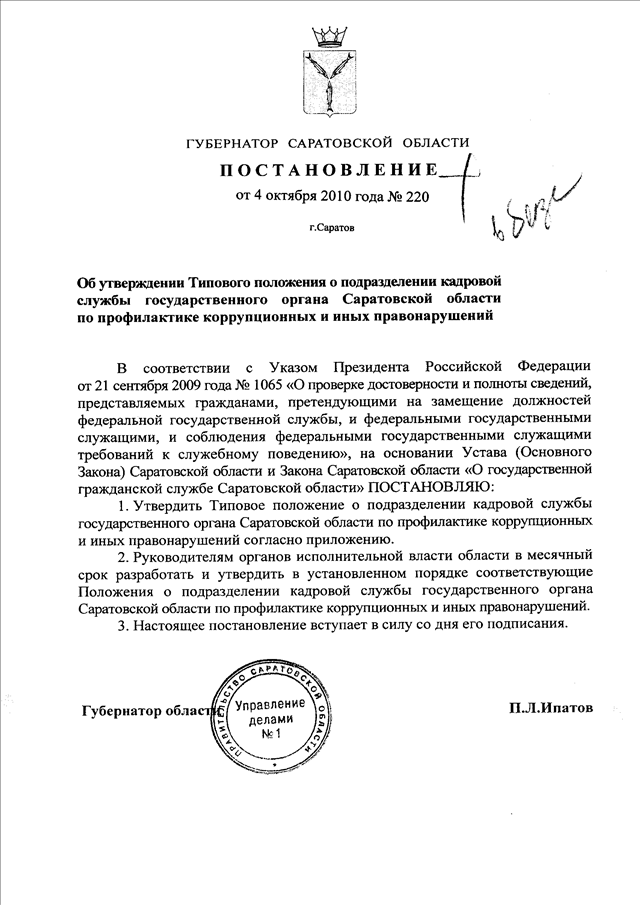 Постановление Губернатора Саратовской области от 04.10.2010 N 220 "Об утверждении Типового положения о подразделении кадровой службы государственного органа Саратовской области по профилактике коррупционных и иных правонарушений"