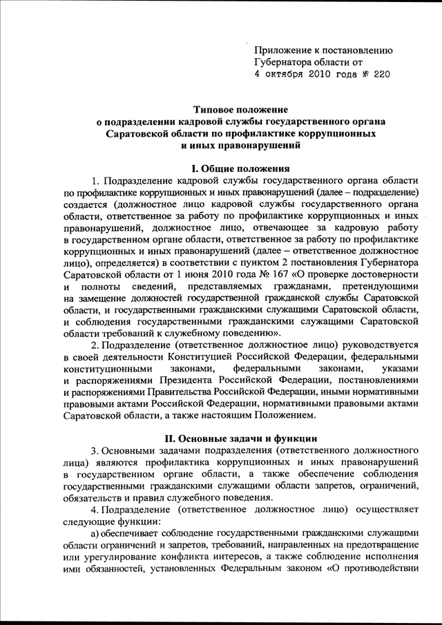 Постановление Губернатора Саратовской области от 04.10.2010 N 220 "Об утверждении Типового положения о подразделении кадровой службы государственного органа Саратовской области по профилактике коррупционных и иных правонарушений"