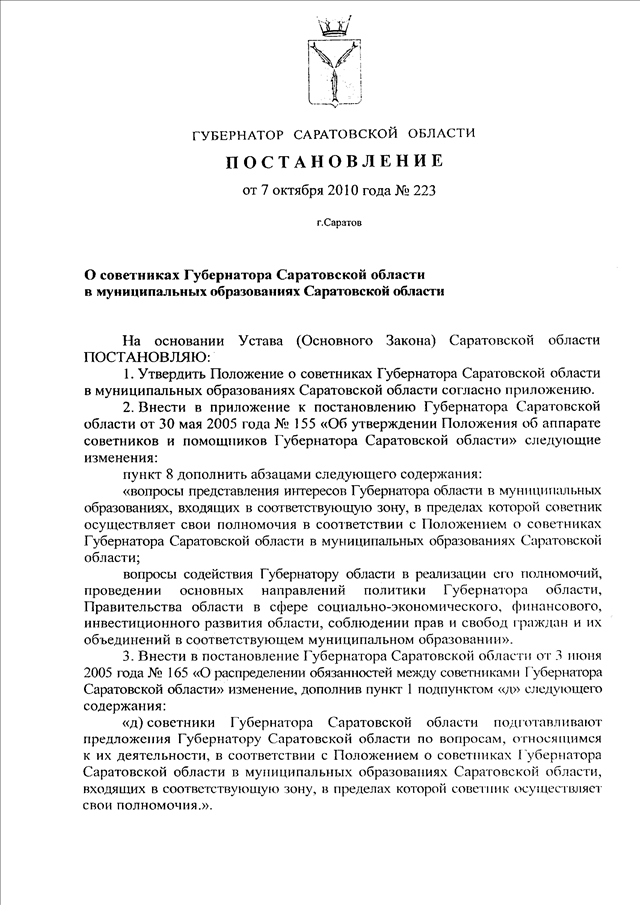 Постановление Губернатора Саратовской области от 07.10.2010 N 223 "О советниках Губернатора Саратовской области в муниципальных образованиях Саратовской области"