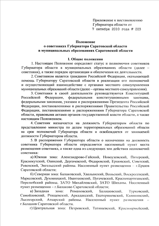 Постановление Губернатора Саратовской области от 07.10.2010 N 223 "О советниках Губернатора Саратовской области в муниципальных образованиях Саратовской области"