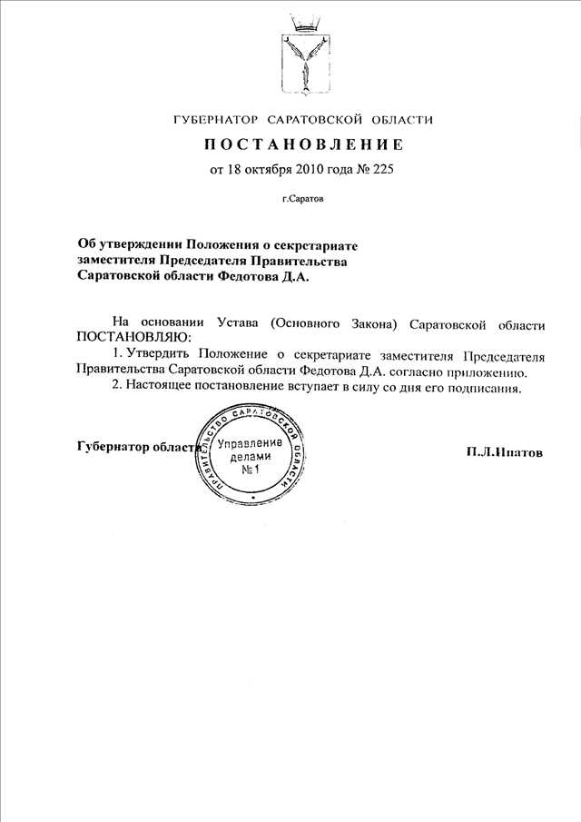 Постановление Губернатора Саратовской области от 18.10.2010 N 225 "Об утверждении Положения о секретариате заместителя Председателя Правительства Саратовской области Федотова Д.А."