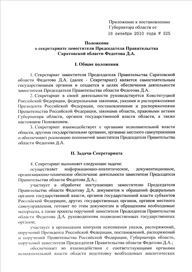 Постановление Губернатора Саратовской области от 18.10.2010 N 225 "Об утверждении Положения о секретариате заместителя Председателя Правительства Саратовской области Федотова Д.А."