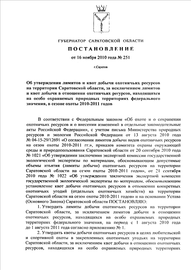 Постановление Губернатора Саратовской области от 16.11.2010 N 251 "Об утверждении лимитов и квот добычи охотничьих ресурсов на территории Саратовской области, за исключением лимитов и квот добычи в отношении охотничьих ресурсов, находящихся на особо охраняемых природных территориях федерального значения, в сезоне охоты 2010 - 2011 годов"