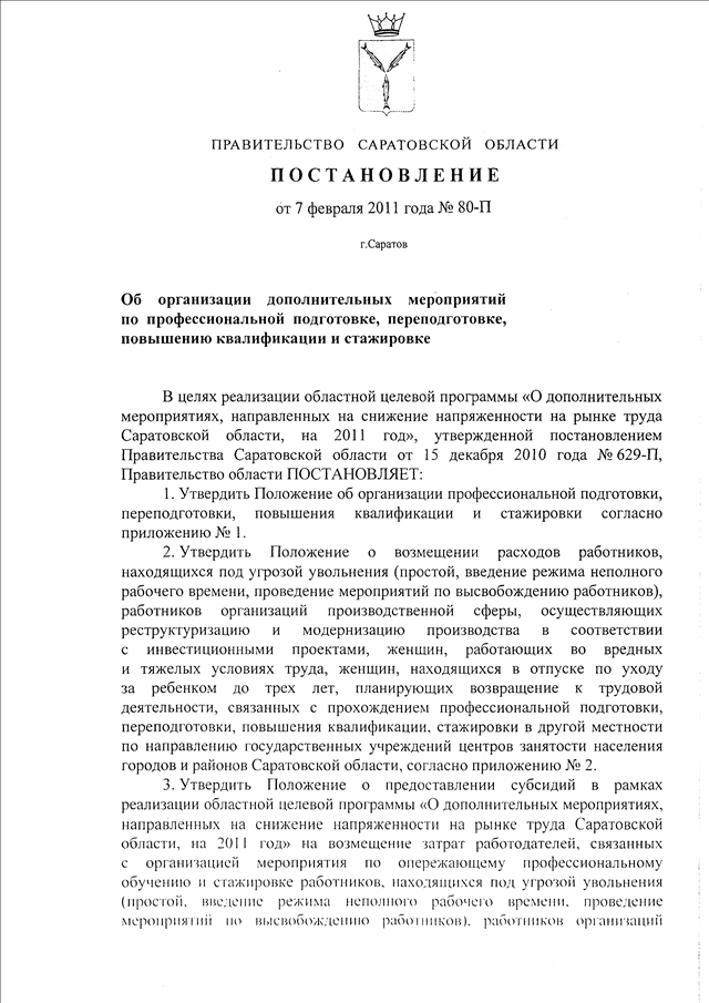 Постановление Правительства Саратовской области от 07.02.2011 N 80-П "Об организации дополнительных мероприятий по профессиональной подготовке, переподготовке, повышению квалификации и стажировке"