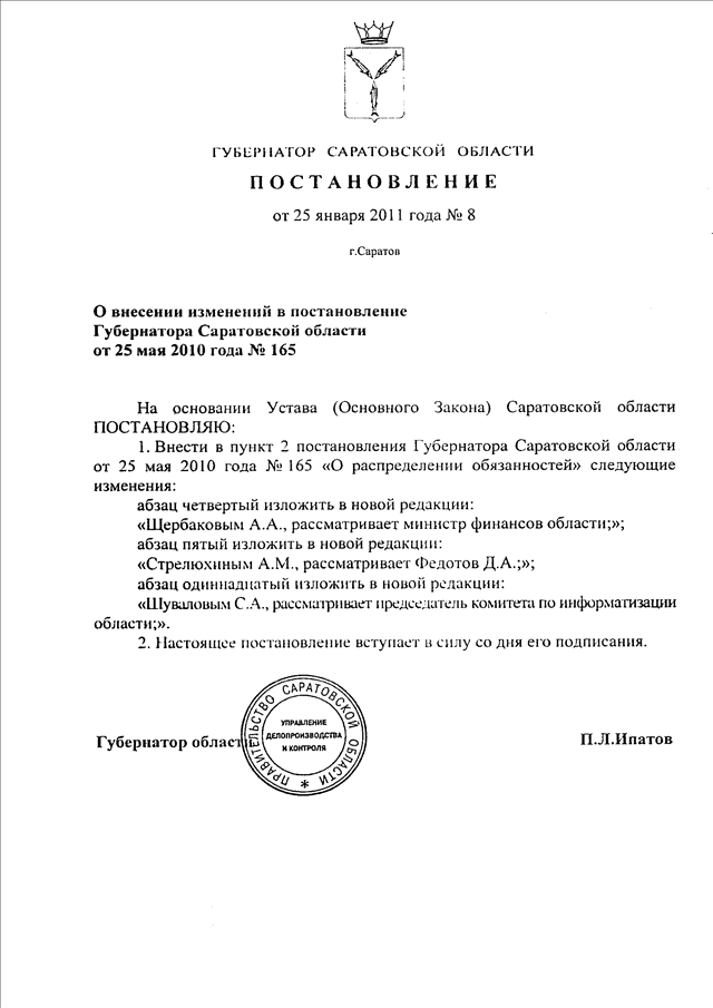 Постановление Губернатора Саратовской области от 25.01.2011 N 8 "О внесении изменений в постановление Губернатора Саратовской области от 25 мая 2010 г. N 165"