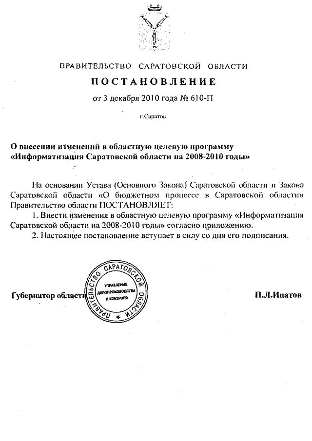 Постановление Правительства Саратовской области от 03.12.2010 N 610-П "О внесении изменений в областную целевую программу "Информатизация Саратовской области на 2008 - 2010 годы"